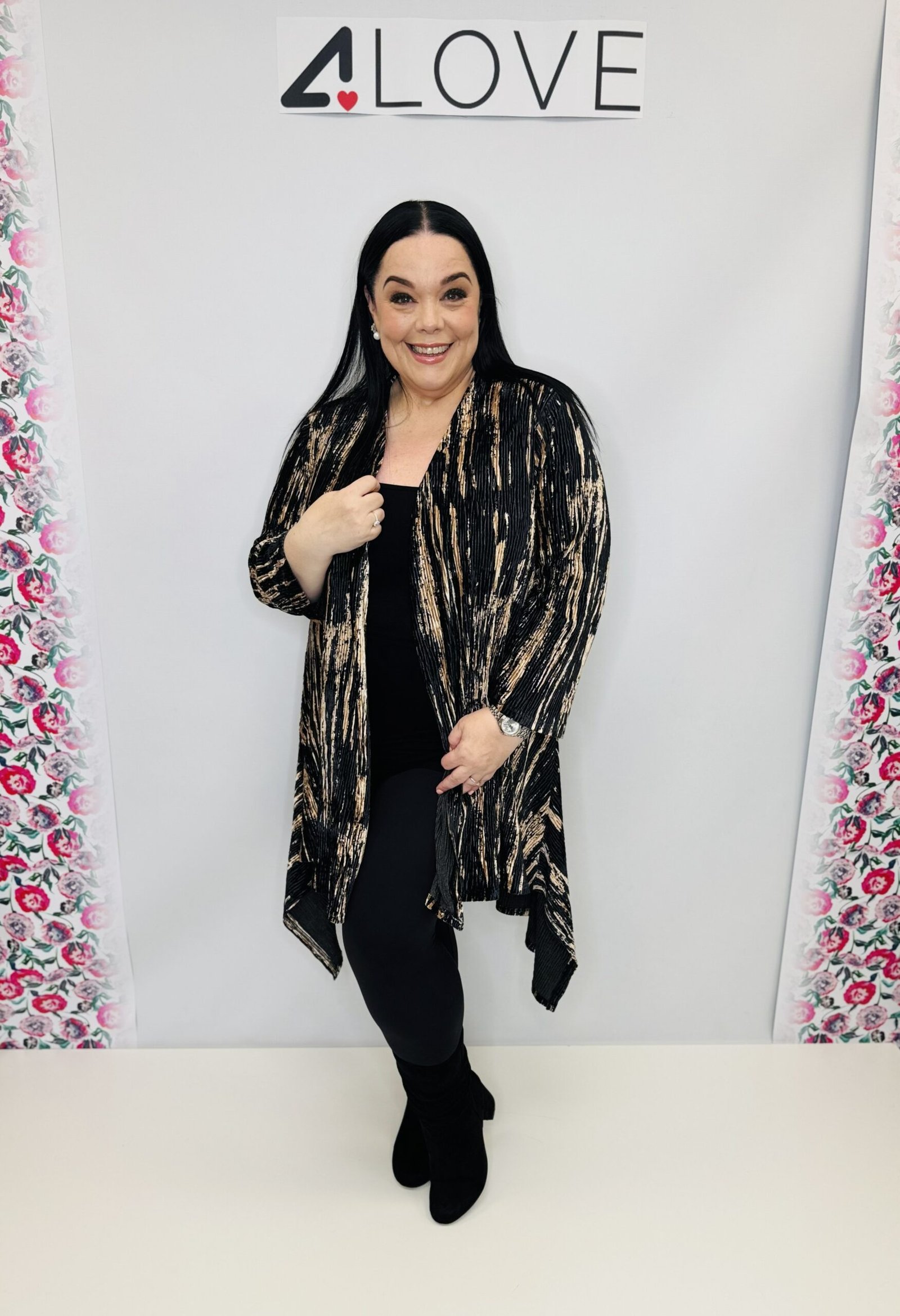 ‘L’ Ribbed velvet feel black and gold waterfall cardigan – one size 8 – 20